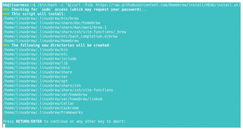 Figure 1: The start of Homebrew's installation script. Notice the assumption of sudo and the installation directory of /home/linuxbrew.