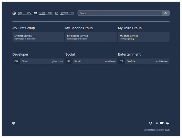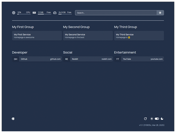 Figure 1 shows the basic structure of any Homepage dashboard. A header occupying the top of the page displays some information widgets, providing host system statistics and a search bar to launch searches via the default search engine, DuckDuckGo [8].