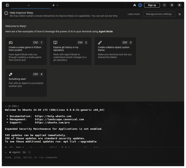 Once installed, you can start Warp from the application menu. You must sign in to use the Warp AI feature and to get the screen shown in Figure 3. What makes Warp different is that it runs as its own app, instead of as a shell plugin or a wrapper.