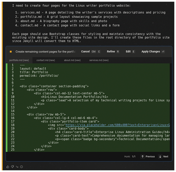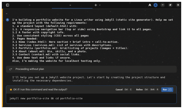 Warp really blew me away when it came to building a whole project using nothing but prompts. For my project, I decided to create a portfolio website using the Jekyll static site generator – all without writing a line of code upfront. To build my portfolio website, I wanted to use the following:
