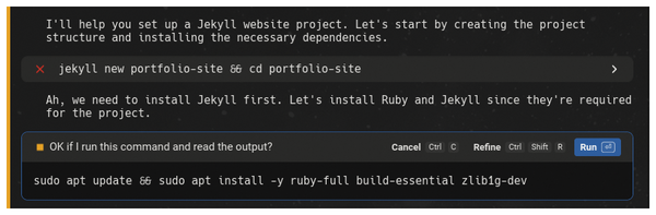 In a nutshell, Warp understood everything. It installed the necessary packages, handled permissions, and created the project structure, page files, CSS, and more. It even started the Jekyll server. Whenever a problem popped up, such as missing gems or permission errors, Warp handled it.