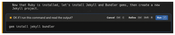 If Warp encounters a package error, it installs the package. In the same way, it resolves any dependency issues that arise while creating the project. After installing the required packages for my website project, Warp installs Jekyll and Bundler gems (Figure 6).