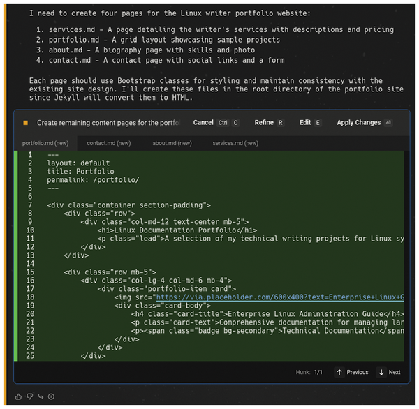After installing the packages, resolving errors, and fixing dependencies, Warp starts creating project files (Figure 7) for the pages I specified: services.md, portfolio.md, about.md, and contact.md.