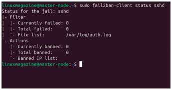 will show the number of currently banned IPs, along with the jail status. If someone attempts to brute force your server, Fail2ban will log the ban as shown in Figure 4.