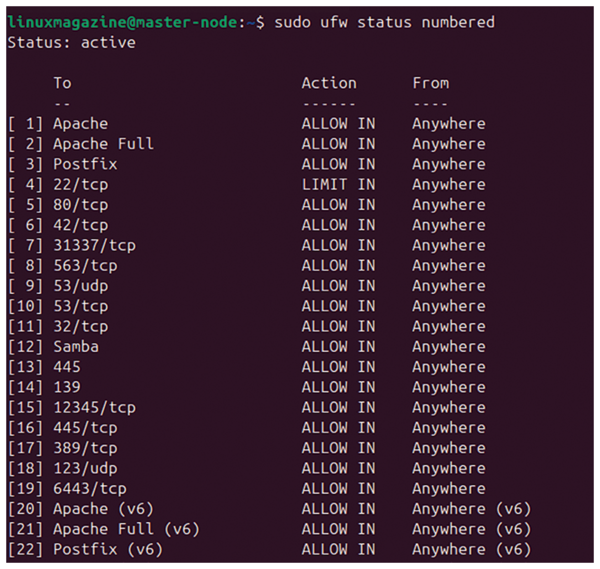 This adds a rule that allows SSH connections but throttles repeated attempts from the same IP (Figure 5). Behind the scenes, it implements iptables rules similar to those shown above.