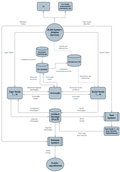 The AlmaLinux Build System interacts with the AlmaLinux Git service to pull the source code of the packages to build. In the same way, the AlmaLinux Git service interacts with the Build System using webhooks to trigger builds whenever the sources of a package have been updated. In addition to building packages from the AlmaLinux Git service, the build system can also build from other Git repositories or from a given source RPM (SRPM).