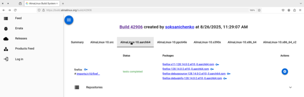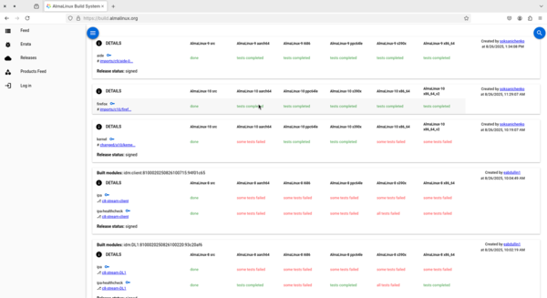 Results of the tests are then forwarded to the Pulp artifacts store in the form of test logs and reports, and the results are then available to the user through the web interface. Approved packages are then signed and marked for release. The AlmaLinux Build System supports managing and releasing errata information for the packages as part of the release process.