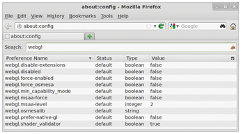 The easiest way to check the status of your computer is with the test page [3] of the WebGL consortium. If it shows no support in Firefox, it is a good idea to compare the settings under about:config with Figure 1. Chrome is somewhat picky concerning graphic cards. If WebGL support does not work immediately, it can be set manually in the configuration file /usr/share/applications/google-chrome.desktop with the line: