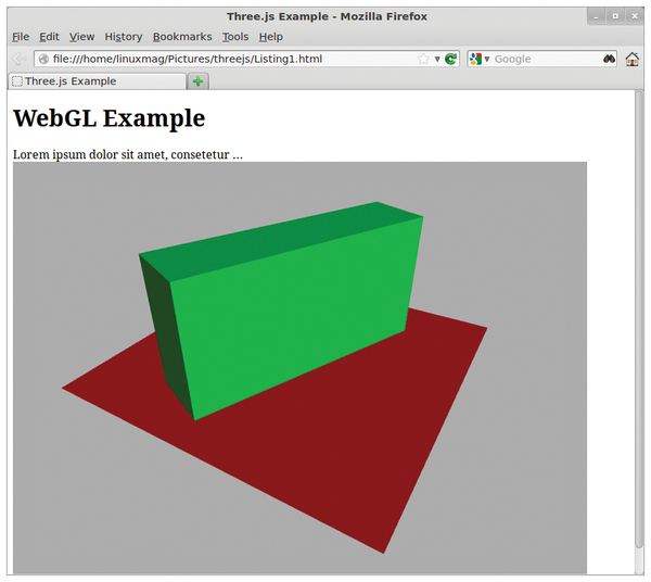 A simple example of this process is found in Listing 1, which generates the web page shown in Figure 2. The example uses the Three.js main library, as well as the Detector.js helper class. The HTML page integrates the libraries with the script tag in the header. Lines 16 and 17 use an absolute URL, but libraries that are available on your own server can also be retrieved over a relative path, such as js/Three.js. In contrast to plugins and applets, the area drawn by Three.js is not a foreign object in the website – the browser treats it as part of the normal HTML.