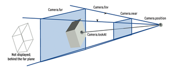 First the code first sets up the camera (from line 67). Three.js provides three camera classes: one with perspective projection (PerspectiveCamera), one with orthogonal projection (OrthographicCamera), and one that can switch between the two (CombinedCamera ). When creating the camera, programmers specify the field of view (fov), the aspect ratio, and the minimum (near) and maximum (far) distances to the geometrical figure. They thus define the viewing frustum, which is the pyramid-shaped volume defining the visible objects of the scene rendered on-- by the browser. Figure 3 shows the frustum with the corresponding Three.js parameters. An example [9] on the project site demonstrates some of these values.