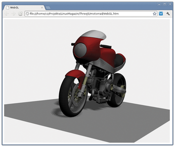 Converters for the command line, as well as plugins for Blender and 3DS Max, are found under utils/exporters in the Three.js source code. More converters can be programmed relatively quickly: Using a self-written converter, the authors exported the motorcycle in Figure 4 to JSON from the JT format common in the CAD world. Listing 2 loads JSON files. The load() function requires both the URL of the JSON file and a callback function for further actions after loading. This function defines the material, creates a mesh, and adds it to the scene, as was done with the manually created geometry in Listing 1.