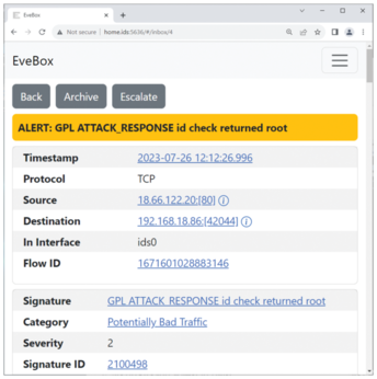 For this test, a client on the home network needs to access the website on http://testmynids.org/uid/index.html. It doesn't matter whether you do this in a web browser or use curl, as long as you access the website via the Fritz!Box. The important thing is that Suricata detects the pseudo attack and EveBox displays it as GPL ATTACK_RESPONSE id check returned root (Figure 4).