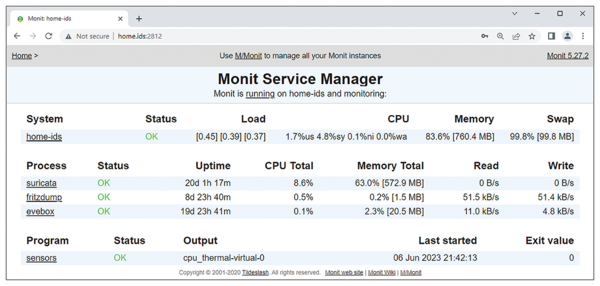 The IDS only works when the Fritzdump and Suricata processes are running. If not, the intrusion detection network is worthless and dangerous IP packets remain undetected. A small monitoring tool like M/Monit [4] can check for the critical processes and restart them if necessary (Listing 7).