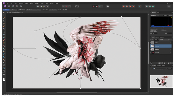Figure 3: Affinity Photo on Linux, using the Mesh Warp Tool to modify the Bird template by Laura Rubin.