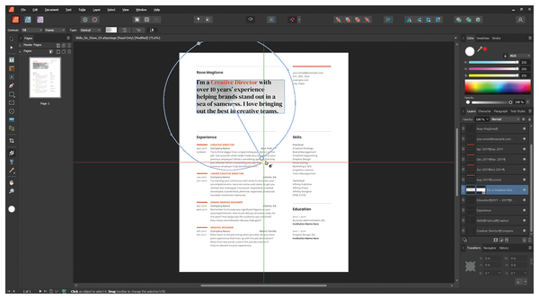 Figure 7 shows an example of editing a CV template. Publisher can help you prepare a portfolio, presentation, book, annual report, or any other document with outstanding visibility. It supports raster and vector PSD, AI, PDF, JPG, TIFF, DWG, and Affinity file formats. The merging option is useful for working with external text, CSV, JSON, or Excel files. Color support is excellent: Publisher supports Pantone (standardized color matching to ensure consistent and accurate color communication), end-to-end CMYK, and ICC color management.
