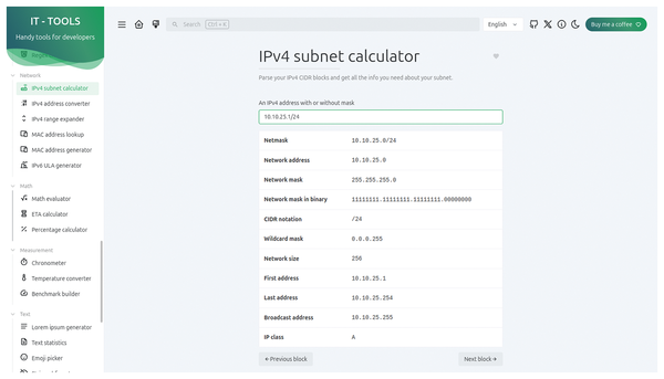 Almost everyone who works with computers has to deal with networks. The MAC address lookup tool in the Network section helps you to identify a device's manufacturer based on its MAC address. IPv4 subnet calculator provides all the information you need about subnets (Figure 2), while IPv4 range expander computes IPv4 networks including CIDR notation [6]. There is also a MAC address generator that helps you create new hardware addresses based on your specifications.