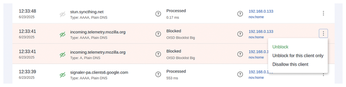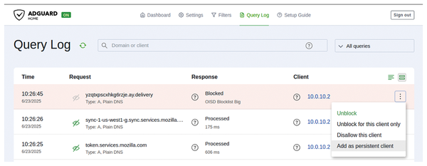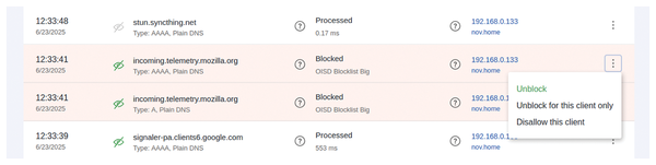 Figure 12: You can easily block or unblock domains, even for a specific client, from AdGuard Home's query log.
