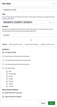 Leave the Use global settings option as is, or uncheck it to choose specific settings for this device such as to use AdGuard's parental control web service for your child's device or to block specific services during designated hours (see the "Blocking Popular Services" box). You can even specify different upstream DNS servers per client. After clicking on Save, the client's name will appear in the query log and in the Top clients list of AdGuard Home's dashboard.