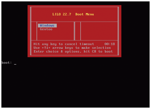 Figure 1: LILO, which did not require filesystem support, was a popular, easy-to-use bootloader at the turn of the millennium.