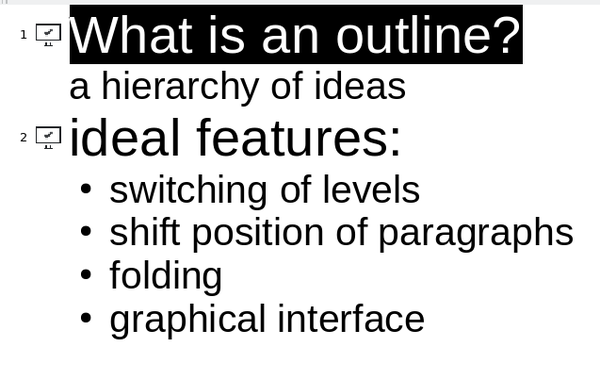 An ideal outline tool would have an easy way to assign a numbering system and to change a paragraph’s outline level. It would also provide a way to shift a paragraph’s position in the outline that is quicker than cutting and pasting. For convenience, the ideal outline tool would also be able to fold items -- that is, temporarily hide and unhide paragraphs. Implemented in a graphical interface, such a tool would be a major new feature. Instead, LibreOffice Writer implements the items on this wish list separately, leaving outlining in confusion.