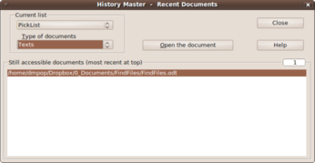 The File -> Recent document of same type command displays the History Master dialog which displays a list of previous documents. But here is the clever part: all documents are grouped by their type, so if you want to narrow the list to .odt files, you can do so by choosing the Texts item from the Type of documents drop-down list. Need to find a spreadsheet? No problem: just select the Spreadsheets item from the drop-down list.
